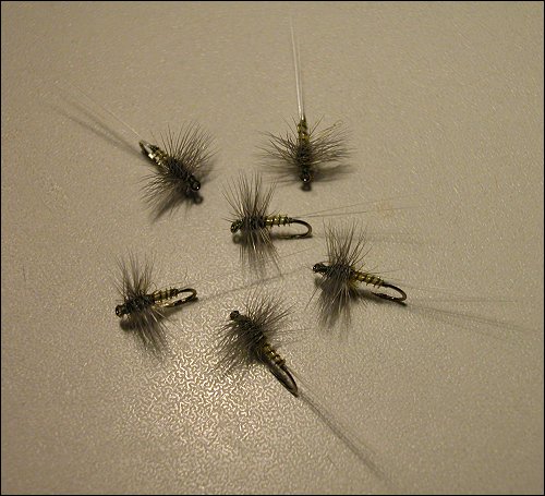 | Eric Peper recently wrote me an email, adding his secret for making Better-Winged Olives: "Enjoyed the article on your BWO pattern, particularly because the design is very close to a design I worked out for BWOs and PMDs a year or so ago -- with one exception. I add a sparse post wing of medium dun Zelon right at the tie-in point of the thorax, and I palmer the dun hackle over the thorax with a couple of wraps on either side of the wing. Reason was that I "see" a shiny wing on most natural duns and the sparse bubnch of Zelon mimics it well." ![]() A batch of Better-Winged Olives shows the body segmentation and heavy thorax areas. |