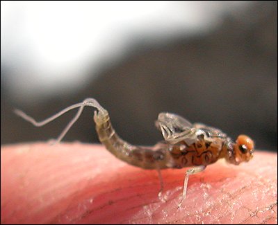 A blue-winged olive cripple mayfly found on the South Platte River in Colorado. Notice the body segmentation and chunky thorax. These are two elements the Better-Winged Olive imitates. Also notice on this severely crippled subject the shortened tail filaments, the underdeveloped wings and forelegs, and the under-developed right eye (the orange left eye is the proper form for this species of mayfly on the South Platte River).