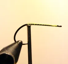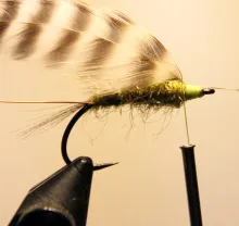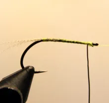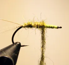 Rüdiger ties the fly in two versions: an olive green one and a brown one. The difference lies in the color of the dubbing. You can of course experiment with more colors.